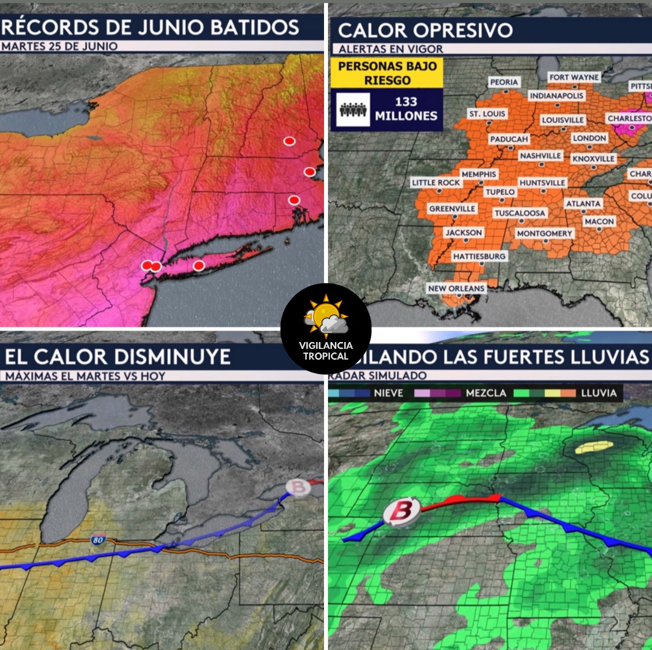 •A esta hora 133 millones de estadounidenses siguen bajo algún tipo de alerta por el calor excesivo desde la costa del golfo hacia el norte hasta el Valle de Ohio y partes del noreste. Ciudades como Filadelfia, Pittsburgh, Charleston, Richmond, Raleigh y Wilmington se encuentran bajo un aviso por calor extremo mientras que Nueva York, Washington DC, Nashville, Atlanta, Charlotte, Huntsville, New Orleans, San Luis, Indianapolis y Louisville están bajo una advertencia por calor.