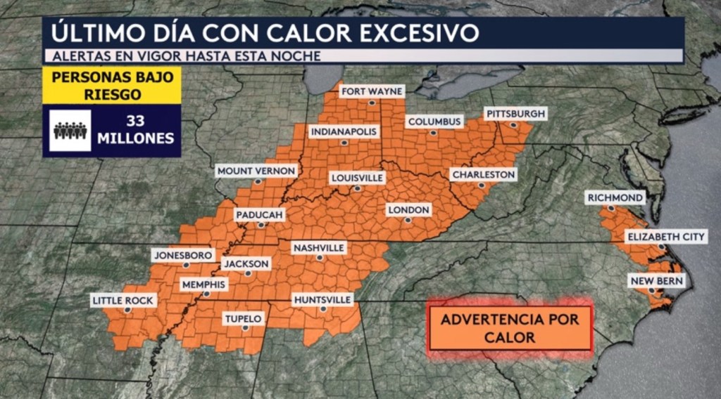 •¡Hoy será el último día con calor excesivo en el este del país! Después de una semana caliente y agobiante, se espera que las alertas por calor que seguirán en vigor hoy para 33 millones de personas se expiren esta noche. Ciudades como Nashville, Memphis, Huntsville, Little Rock, Louisville, Indianapolis, Columbus, Pittsburgh, Richmond y Elizabeth City estarán bajo una advertencia por calor para esta jornada del viernes.