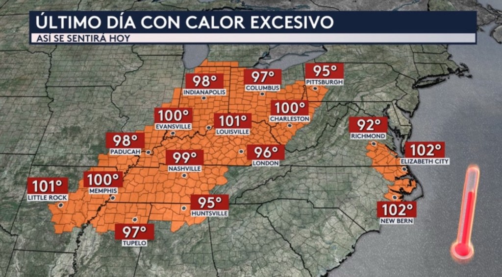 •Las sensaciones térmicas para estas ciudades bajo la advertencia por calor estarán tanto en los 90° como en los 100° esta tarde. Ciudades como Louisville, Evansville, Charleston, Memphis, Little Rock, Elizabeth City y New Bern se sentirán como los tres dígitos.