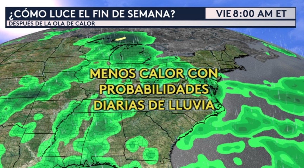 •Se espera que haya menos calor este fin de semana a través de la mitad este del país con altas probabilidades de lluvia. Las temperaturas máximas en las ciudades mostradas estarán mucha mas bajas que esta semana con probabilidades de experimentar lluvias y/o tormentas eléctricas desde hoy hasta el domingo.