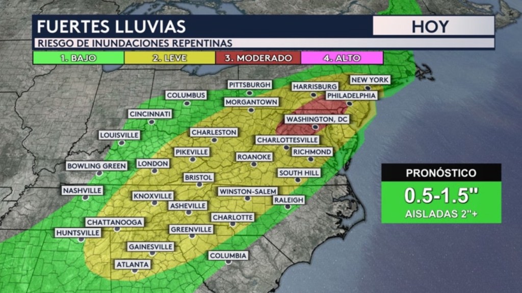 Pero no solo estaremos vigilando las fuertes lluvias y posibles inundaciones ahí sino también a través de gran parte del este del país con el paso del frente frío antes mencionado. Habrán riesgos mínimos de nivel 1 de 4 y leves de nivel 2 de 4 en vigor desde el sureste hacia el norte a lo largo del Atlántico Medio, los Apalaches y el Valle superior de Ohio hasta Nueva Inglaterra. Nueva York, Atlanta, Charlotte, Raleigh, Nashville, Louisville, Cincinnati, Pittsburgh, Richmond y Charleston serán algunas ciudades que estarán bajo algún tipo de riesgo de inundaciones hoy. Estamos pronosticando que caiga entre 0.5 a 1.5 pulgadas de lluvia dentro de toda esta zona con totales aislados más altos superando las 2 pulgadas.