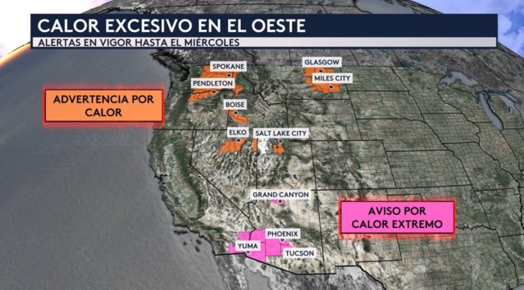 •Nos quedamos en el oeste donde además del riesgo de incendios estaremos vigilando las temperaturas calientes. Hay advertencias por calor en vigor para los estados de Washington, Oregón, Idaho, Utah, Nevada y Montana y avisos por calor extremo para Arizona y California. Todas las alertas menos las de Montana se expirarán esta noche. Las alertas en vigor para Montana expirarán el miércoles por la noche.