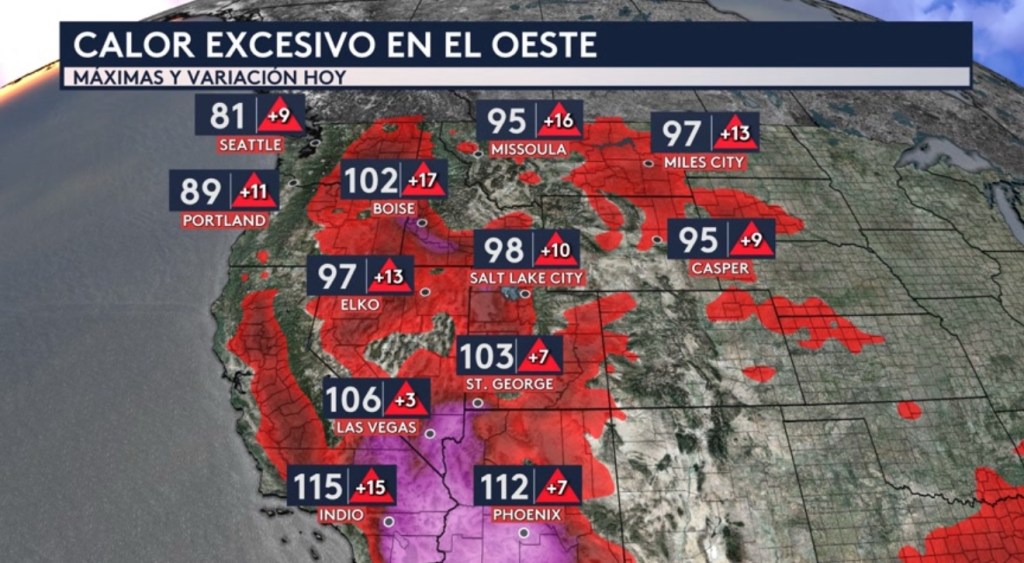 •Las temperaturas máximas hoy estarán en los 100° para ciudades como Phoenix, Indio, Las Vegas, Boise y St. George y en los 90° en Elko, Salt Lake City, Casper, Miles City y Missoula. Seattle y Portland tendrán máximas en los 80°. Todas estas temperaturas mostradas serán de entre 5 a 20° por encima del promedio para esta época del año.