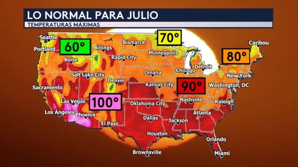 •Vemos las temperaturas máximas normales para el mes de julio. En el segundo mes de verano típicamente se observan máximas en los 70° en los sectores más al norte cerca a la frontera con Canadá y en las Montañas Rocosas, Sierra Nevada y Cascades y en los 80° y 90° hacia el resto del país. Las máximas normales para los desiertos del suroeste del país son de 100°.