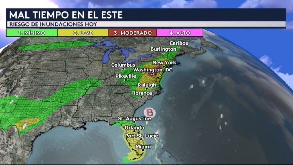 Tendremos riesgos mínimos (nivel 1 de 4) y leves (nivel 2 de 4) de inundaciones para el centro y sur de Florida y desde Carolina del Norte hasta Vermont. Incluye ciudades como Miami, Orlando, Port St. Lucie, Raleigh, Richmond, Nueva York y Albany.