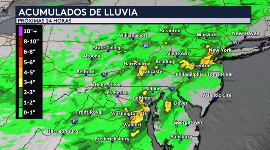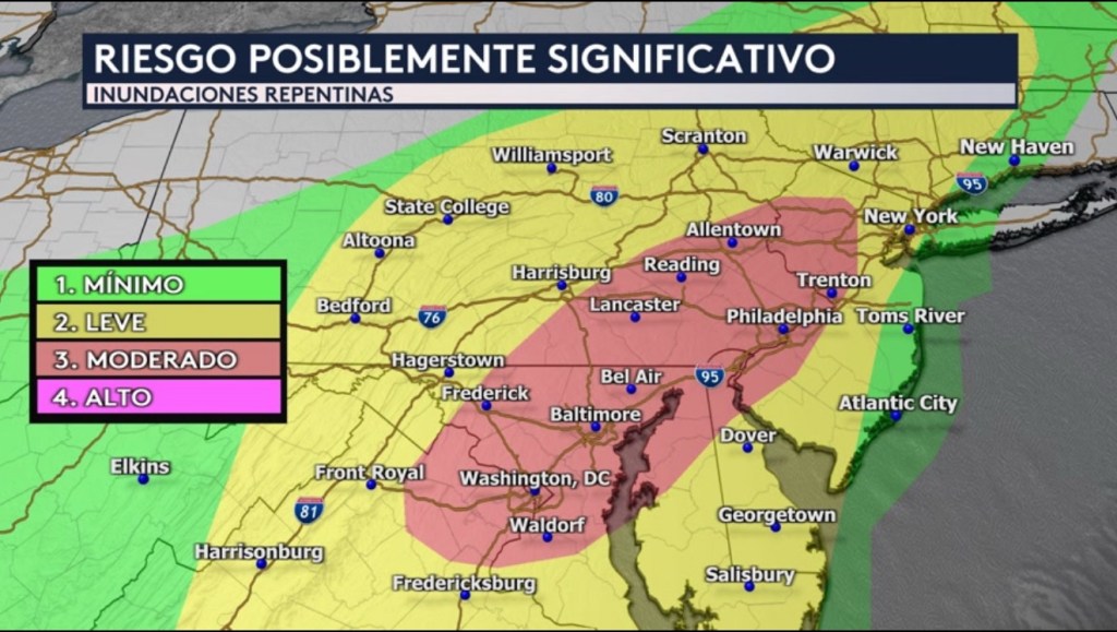 Pero nos acercamos a la zona que está bajo un riesgo preocupante de nivel 3 de 4 en la sombra roja que abarca desde Virginia hasta Nueva Jersey. Aquí es donde se encuentran ciudades como Washington DC, Baltimore, Philadelphia y Trenton.