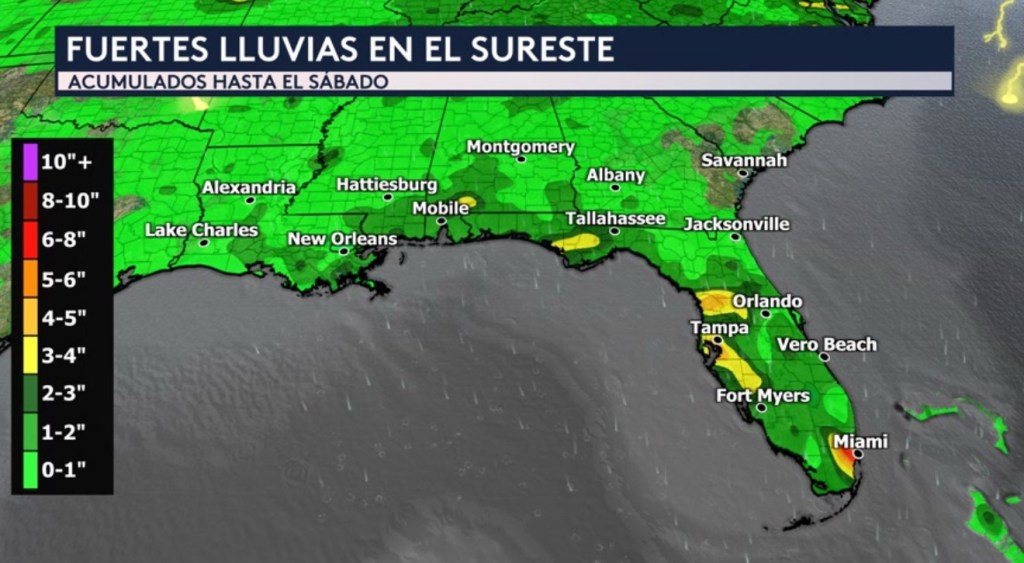 Nuestro modelo de pronóstico nos muestra que Florida pudiera recibir la mayor cantidad de lluvia entre hoy y el sábado por la mañana. Debido al largo plazo de este pronóstico que se extiende por 5 días, es probable que la ubicación de estos acumulados cambiaría durante los próximos días. Pero lo que podemos apreciar es que donde sí caigan estas lluvias torrenciales, estarán posiblemente produciendo acumulados de 1 a 2 pulgadas generalizadas a través de Florida con totales aislados más altos superando las 3 o 4 pulgadas.