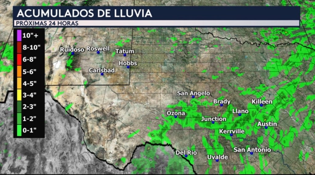 •Nuestro modelo de pronóstico nos muestra acumulados aislados de lluvia de entre 2 a 4 pulgadas en el Hill Country de Texas durante las próximas 24 horas. Recuerda que por la saturados que están los suelos en este sector del estado de la estrella solitaria no requerirá mucha lluvia adicional para provocar inundaciones repentinas. En Nuevo México, tenderemos acumulados aislados mayormente de hasta una pulgada en los alrededores de la ciudad de Ruidoso, pero hay focos más pequeños que nos muestran casi hasta 2 pulgadas.