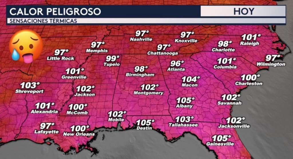 •El sureste del país estará lidiando con un calor excesivo hoy ya que se espera que las sensaciones térmicas superen los tres dígitos y lleguen posiblemente a los 105°F en ciudades como Gainesville y Destin en Florida y Albany en Georgia. Otras ciudades como New Orleans y Shreveport en Louisiana; Jackson en Mississippi; Montgomery y Mobile en Alabama; Jacksonville y Tallahassee en Florida; Savannah y Macon en Georgia; Charleston y Columbia en Carolina del Sur; y Raleigh en Carolina del Norte estarán experimentando sensaciones térmicas en los tres dígitos esta tarde.