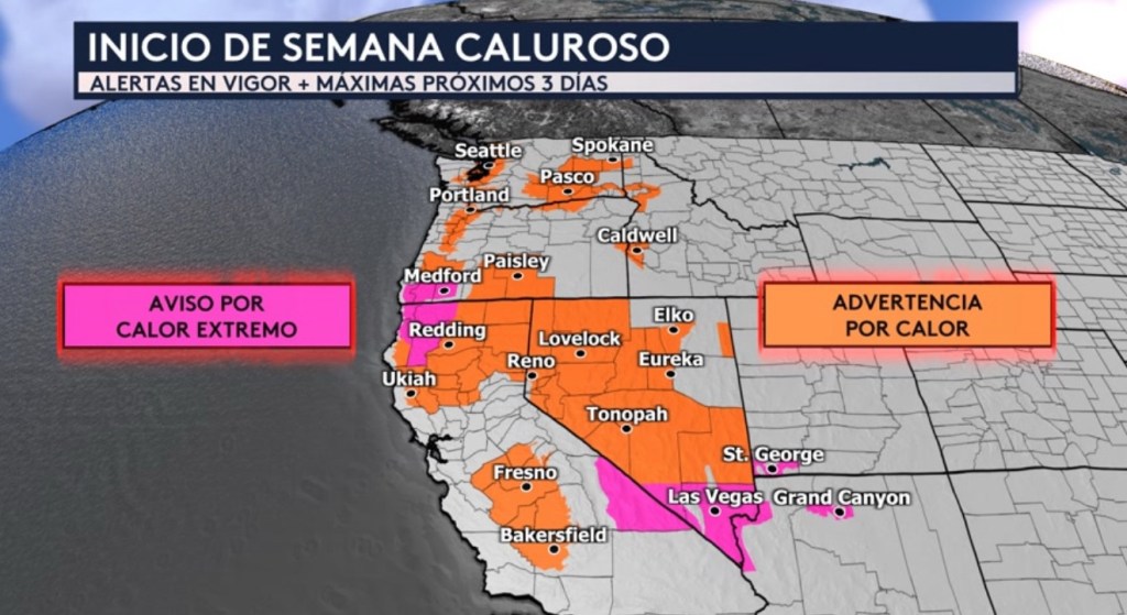 •No solo en el sureste sino también hacia el oeste del país es donde estaremos vigilando las temperaturas peligrosas. Hay advertencias por calor en vigor para ciudades como Bakersfield, Fresno, Redding y Ukiah en California; Elko, Eureka, Reno en Nevada; Caldwell en Idaho; Portland en Oregon; y Seattle, Yakima y Spokane en Washington. Hay avisos por calor extremo para ciudades como Las Vegas en Nevada, St. George en Utah, el Gran Cañón en Arizona y Medford en Oregon.