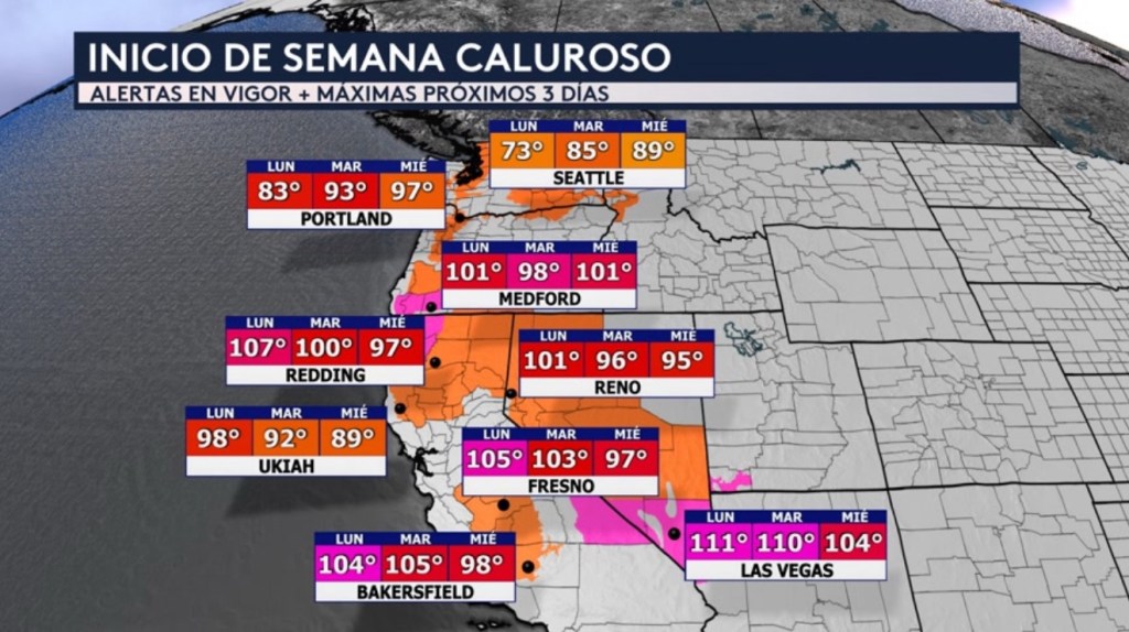 •Las máximas durante los próximos días estarán aumentando en el sector del Pacífico Noroeste y en ciudades como Seattle y Portland, donde a partir del miércoles estarán en los altos 80°F casi en los 90°F y en los altos 90°F, respectivamente. Las demás ciudades mostradas a través del oeste de EE. UU. estarán experimentando un inicio de semana caliente pero verán un descenso en las temperaturas durante los próximos días. Las Vegas estará llegando a los 111°F esta tarde, Redding a los 107°F, Fresno a los 105°F, Bakersfield a los 104°F y Reno y Medford a Los 101°F.