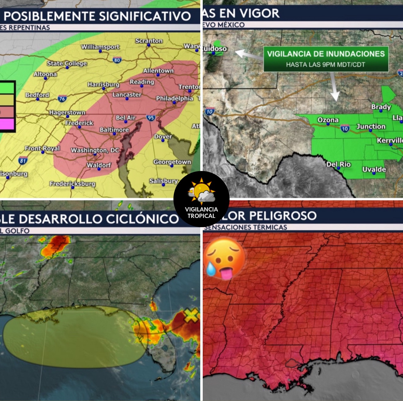 •Hay vigilancias por inundaciones en vigor hasta las 9:00PM esta noche hora local no solo para el Hill Country de Texas sino también para una parte del estado de Nuevo México que incluye otra ciudad que fue devastada por las inundaciones la semana pasada: Ruidoso. En Texas, las ciudades que se encuentran bajo esta alerta por inundaciones incluyen Austin, Kerrville, Llano, Ozona y Del Río.