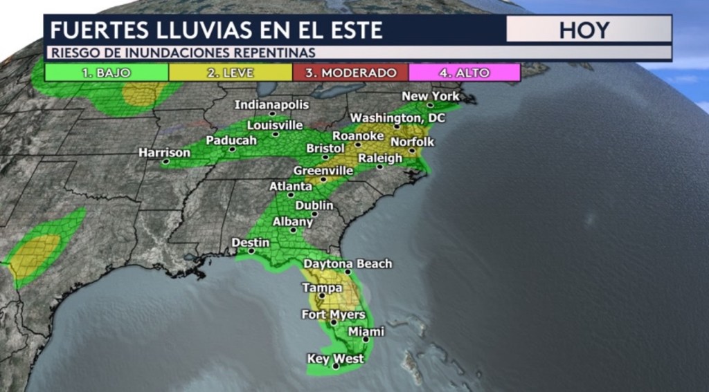 Ciudades que se encontrarán bajo un riesgo elevado de inundaciones de nivel 2 de 4 durante esta jornada del martes incluyen Tampa y Orlando en Florida; Greenville en Carolina del Sur; Roanoke, Norfolk, Richmond y Virginia Beach en Virginia; y Washington DC.