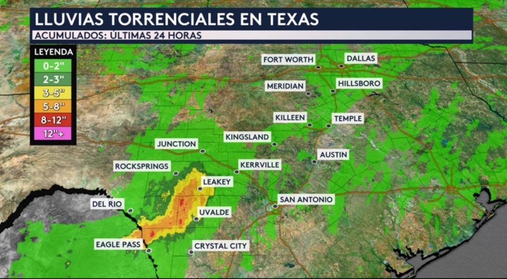 •También vimos lluvias intensas en el sur-centro de Texas a lo largo del Río Grande al sur de la interestatal 10, ¡donde nuestros estimados de radar nos muestra que se han acumulado hasta 12 pulgadas de lluvia en las últimas 24 horas! Afortunadamente estos fuertes aguaceros no ocurrieron sobre la parte del Hill Country de Texas que fue severamente afectada por las inundaciones devastadoras del 4 de julio.