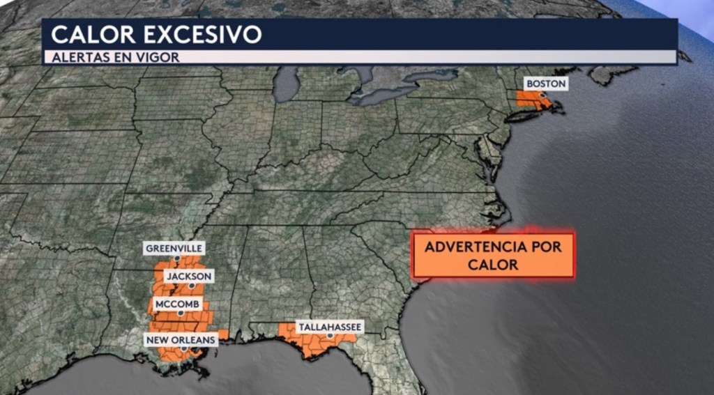 •Habrá advertencias por calor en vigor para partes del sureste y noreste del país hoy que incluye ciudades como New Orleans en Louisiana, Jackson en Mississippi, Tallahassee en Florida y Boston en Massachusetts.