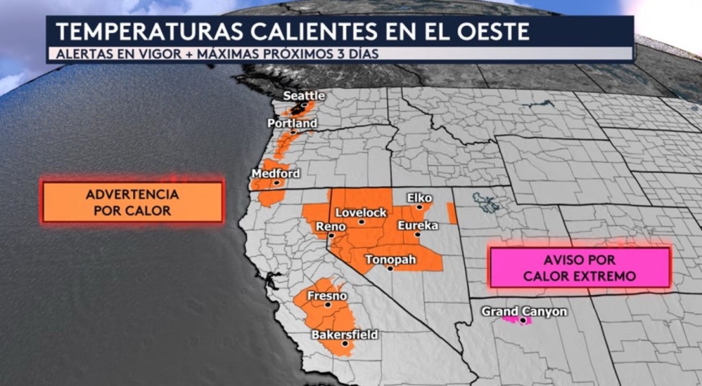 •También se está sintiendo ese calor al oeste del país, donde hay advertencias por calor para partes de los estados de Nevada, California, Oregón y Washington y un aviso de calor extremo para el Gran Cañón al norte del estado de Arizona. Algunas ciudades afectadas incluyen Reno y Elko en Nevada; Fresno y Bakersfield en California; Medford y Portland en Oregon; y Seattle en Washington.