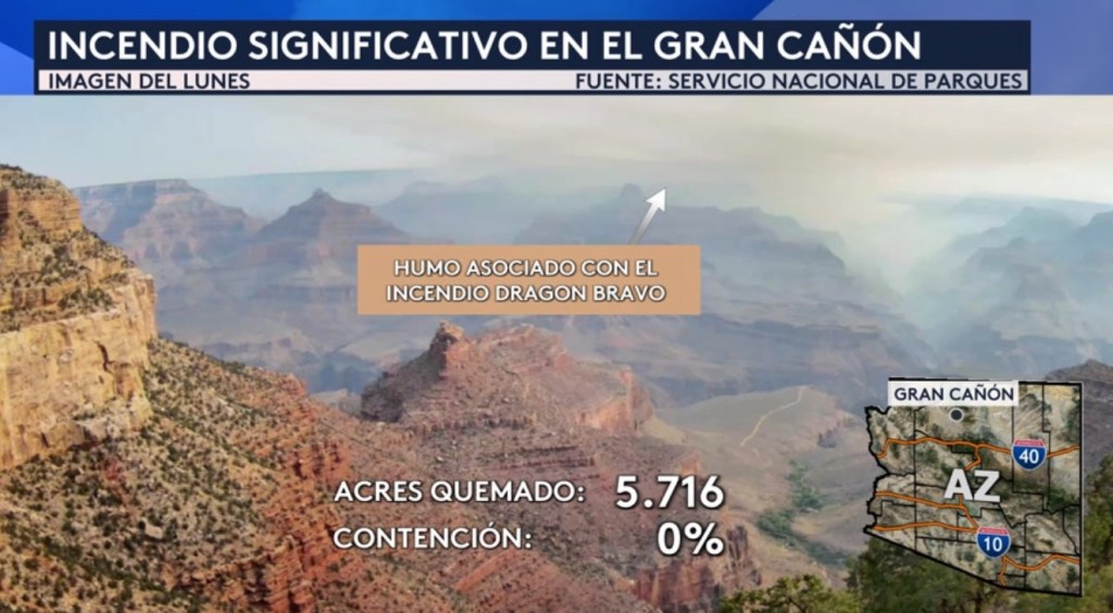 •Quedándonos en el oeste, nos vamos para el norte de Arizona donde tenemos a un incendio significativo quemando en el Gran Cañón, unos de los parques nacionales más conocidos en el país. Esta imagen del lunes muestra todo el humo asociado con este incendio, llamado Dragon Bravo. Hasta el momento, ha quemado 5.716 acres y lamentablemente sigue contenido al 0 %.