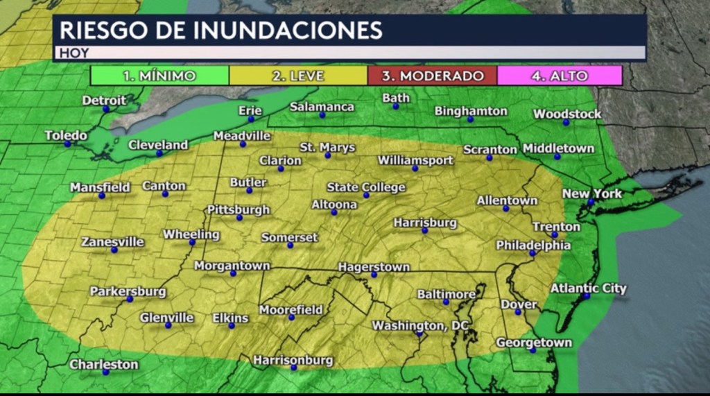 •Hoy nuevamente habrá un riesgo elevado de nivel 2 de 4 de inundaciones repentinas para los estados del Atlántico Medio. Incluye ciudades como Pittsburgh, Philadelphia, Allentown, State College en Pennsylvania; Trenton en Nueva Jersey; Washington DC; Baltimore en Maryland; Harrisonburg en Virginia; Parkersburg y Morgantown en Virginia Occidental; y Zanesville en Ohio.