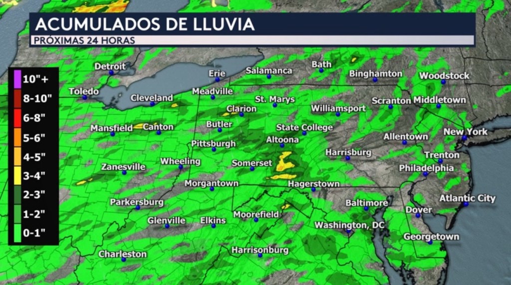 •Estamos pronosticando acumulados de lluvia generalizados de hasta una pulgada a través de toda esta zona que abarca el este de los Grandes Lagos y los estados del Atlántico Medio durante las próximas 24 horas. Los acumulados aislados, sin embargo, pudieran superar las 3 o 4 pulgadas en partes de Pennsylvania, Ohio, Nueva York, Virginia y Virginia Occidental.