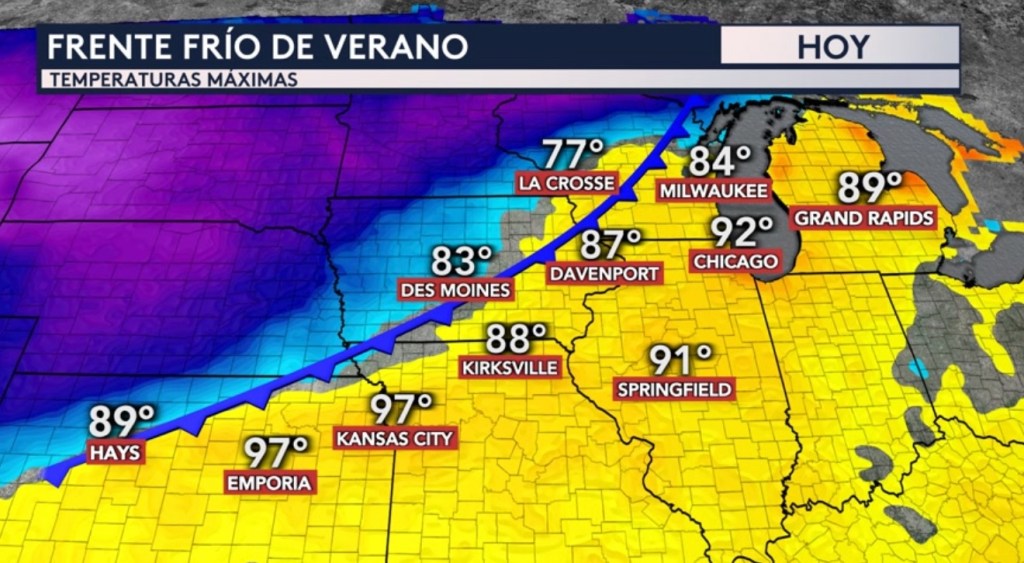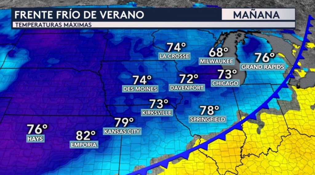 •¡Pero a partir de mañana detrás de este frente frío se espera un enfriamiento fuera de temporada y una masa de aire mucha más placentera donde las temperaturas máximas descenderán entre 10 y 20°F en solo 24 horas! Tanto Chicago como Kansas City con máximas hoy en los 90°F descenderán a los 70°F mañana.