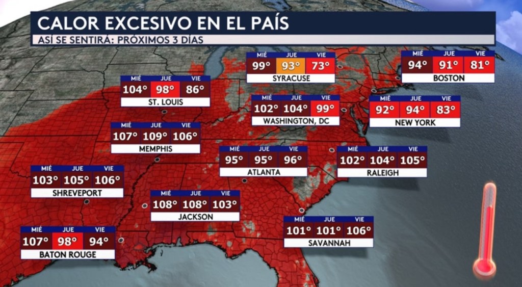 A partir de mañana jueves, la sensación subirá a los 109°F en Memphis, a los 94°F en la ciudad de Nueva York y a los 104°F en Washington DC. Para el viernes se sentirá como los 105°F en Raleigh en Carolina del Norte y los 106°F tanto en Savannah en Georgia como en Shreveport en Louisiana.