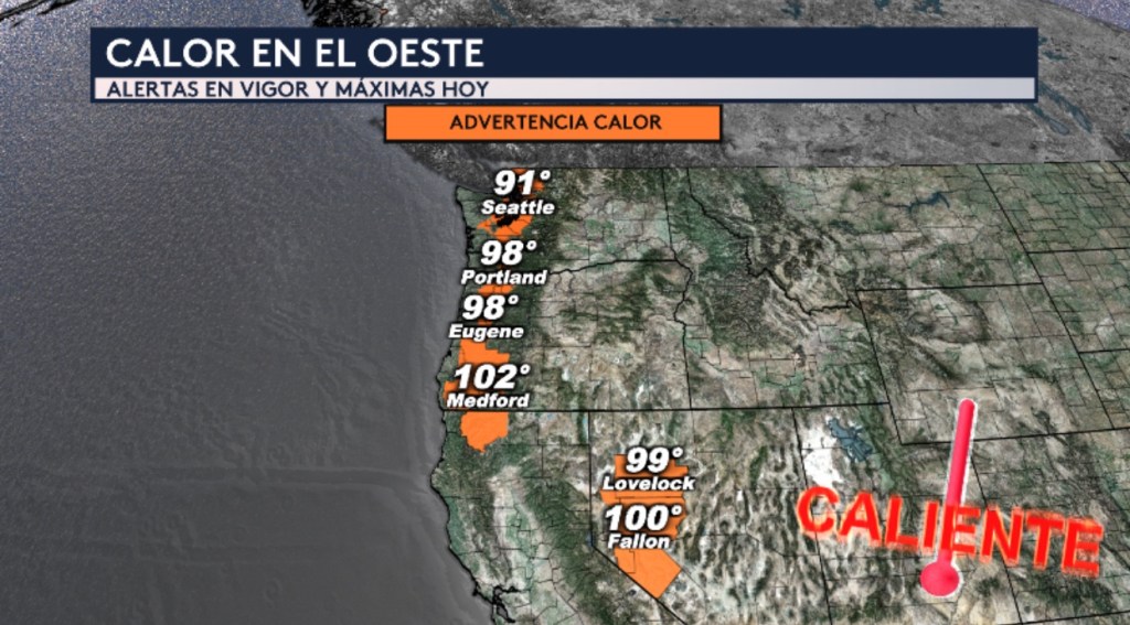 •Hay advertencias por calor en vigor hasta esta noche para el oeste del país que incluye los estomas de Washington, Oregón, California y Nevada. Ciudades como Seattle, Portland, Eugene, y Lovelock estarán registrando máximas en los 90°F mientras que Medford en Oregón y Fallon en Nevada registran temperaturas en los tres dígitos.