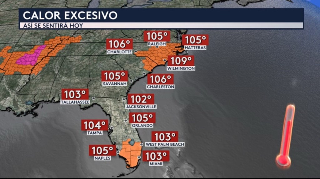 •Las sensaciones térmicas esta tarde para ciudades como Tampa, Orlando, Jacksonville, Savannah y Charleston; aunque no están bajo ningún tipo de alerta por calor; serán peligrosas y superarán los tres dígitos. Se sentirá como los 109°F en Wilmington; como los 106°F en Charlotte y Charleston; como los 105°F en Orlando, Naples, Savannah y Raleigh; y como los 104°F en Tampa.