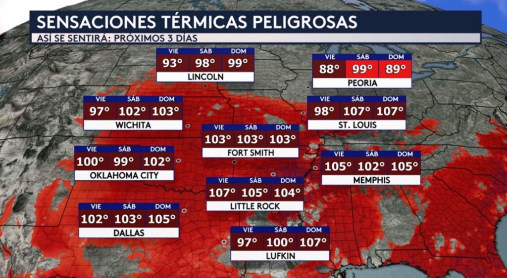 •Veremos como en los próximos días este calor se irá desplazando al norte a través de las planicies del país y a lo largo del Valle del Río Mississippi. Las sensación térmica, cuando hoy estará en los 102°F, llegará a los 105°F en Dallas en Texas a partir del domingo. La sensación en Lufkin en Texas que hoy estará en Los 97°F subirá a los 107°F el domingo. Las sensaciones térmicas en Wichita en Kansas estarán superando los tres dígitos a partir de mañana sábado y las de San Luis en Missouri estarán llegando a los 107°F tanto para el sábado como para el domingo. Más al norte hacia los estados de Nebraska y Illinois las ciudades de Lincoln en Nebraska y Peoria en Illinois se estarán acercando a los tres dígitos este fin de semana.