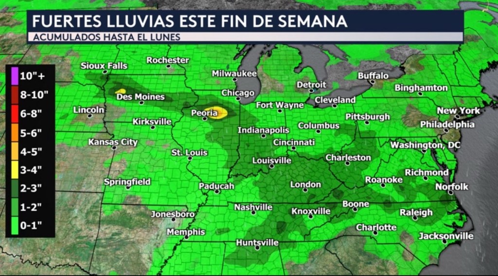 •No se espera tanta lluvia este fin de semana en Kansas City, pero donde sí lo tendremos es desde el Cinturón de Maíz alrededor del estado de Iowa hacia el sureste hasta los estados del Atlántico Medio. En esta extensa franja se pudiera producir acumulados de lluvia de 1 a 2 pulgadas con acumulados aislados más altos de entre 2 a 3 pulgadas en la región de las Montañas Apalaches, el Atlántico Medio y el Valle de Tennessee y de entre 3 a 5 pulgadas en el Medio Oeste y el Cinturón de Maíz. Estos acumulados son válidas desde hoy hasta el lunes por la mañana.