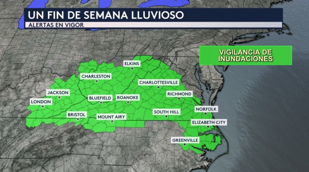 •Debido a estos acumulados pronosticados, una vigilancia de inundaciones ha sido emitida para los estados del Atlántico Medio, el sur de las Montañas Apalaches y el Valle superior del Río Ohio. Incluye ciudades como Norfolk, Richmond y Roanoke en Virginia; Charleston y Elkins en Virginia Occidental; Greenville en Carolina del Norte; Bristol en Tennessee; y Jackson y London en Kentucky. Esta alerta por inundaciones expirará esta noche.