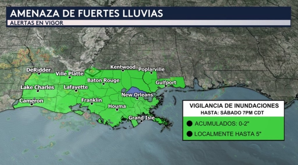 •Hay una vigilando de inundaciones que seguirá en vigor para los estados de Louisiana y Mississippi hasta el sábado por la noche. Estamos pronosticando acumulados de lluvia adicionales de entre 0 a 2 pulgadas con totales aislados más altos de hasta 5 pulgadas.