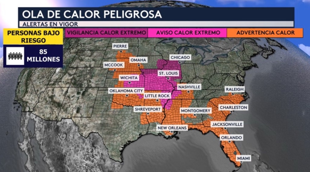 •Una ola de calor peligrosa estará afectando al país para comenzar la semana laboral ya que hay 85 millones de estadounidenses bajo algún tipo de alerta por calor hoy desde Dakota del Sur hasta la península de Florida. Ciudades como Miami, Orlando, Jacksonville, Charleston, Raleigh, Montgomery, Little Rock, New Orleans, Nashville, Oklahoma City, Omaha y Pierre estarán bajo una advertencia por calor mientras que lugares como Memphis, Kansas City, San Luis y Wichita se encuentran bajo un aviso por calor extremo. Chicago está bajo una vigilancia por calor extremo.
