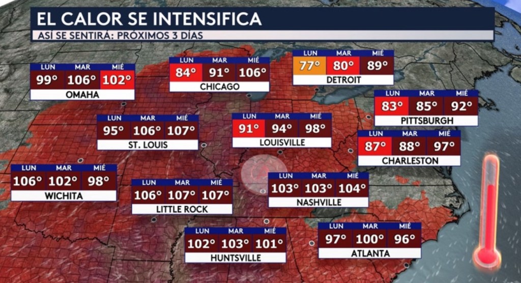•Veremos como en los próximos días este domo de calor, que hoy está ubicado sobre el Valle inferior del Río Mississippi, se desplazará y ampliará más al norte hacia las regiones del Medio Oeste, los Grandes Lagos y el Valle de Ohio. Esto permitirá que ciudades como Chicago vean un ascenso en sus sensaciones térmicas desde hoy hasta el miércoles donde se sentirá tan caliente como los 106°F a partir de entonces. Ciudades como Wichita, San Luis, Omaha y Little Rock tendrán una sensación térmica de entre 105 y 110°F durante los próximos 3 días. Nashville y Huntsville tendrán una sensación en el rango de los 100°F y 105°F. Tanto Charleston como Pittsburgh se sentirá como los 90°F a partir de mediados de semana.