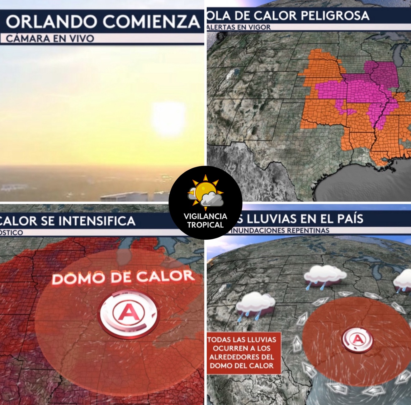 •Una ola de calor peligrosa estará afectando al país para comenzar la semana laboral ya que hay 85 millones de estadounidenses bajo algún tipo de alerta por calor hoy desde Dakota del Sur hasta la península de Florida. Ciudades como Miami, Orlando, Jacksonville, Charleston, Raleigh, Montgomery, Little Rock, New Orleans, Nashville, Oklahoma City, Omaha y Pierre estarán bajo una advertencia por calor mientras que lugares como Memphis, Kansas City, San Luis y Wichita se encuentran bajo un aviso por calor extremo. Chicago está bajo una vigilancia por calor extremo.