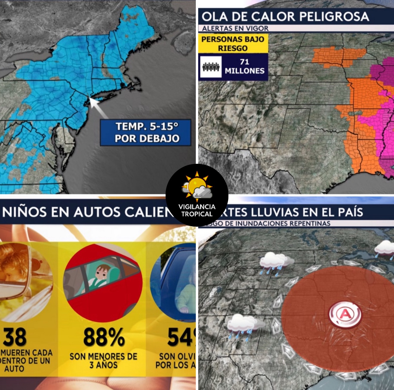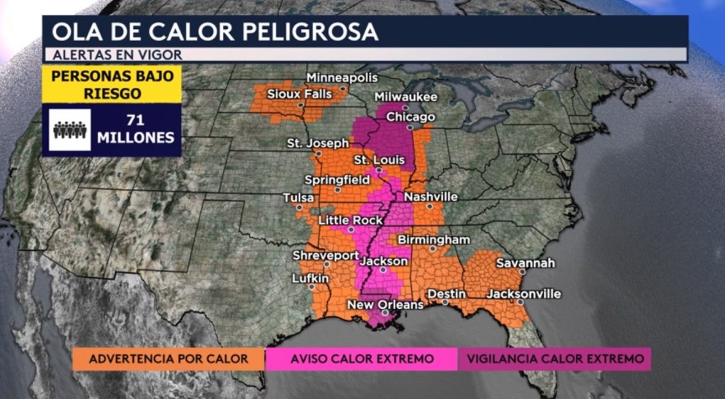 •Pero la historia principal a través del país será el calor peligroso donde actualmente tenemos a 71 millones de estadounidenses bajo alertas por calor. Ciudades como Jacksonville en Florida; Savannah en Georgia; Birmingham, Mobile, Montgomery y Huntsville en Alabama; Shreveport en Louisiana; Beaumont y Lufkin en Texas; Nashville en Tennessee; Tulsa en Oklahoma; Kansas City, St. Joseph y Springfield en Missouri; Sioux Falls y Pierre en Dakota del Sur; y Minneapolis en Minnesota están bajo una advertencia por calor. San Luis en Missouri; Memphis en Tennessee; Little Rock en Arkansas; y Jackson en Mississippi están bajo un aviso por calor extremo. Chicago en Illinois, Milwaukee en Wisconsin y New Orleans en Louisiana están bajo una vigilancia por calor extremo.