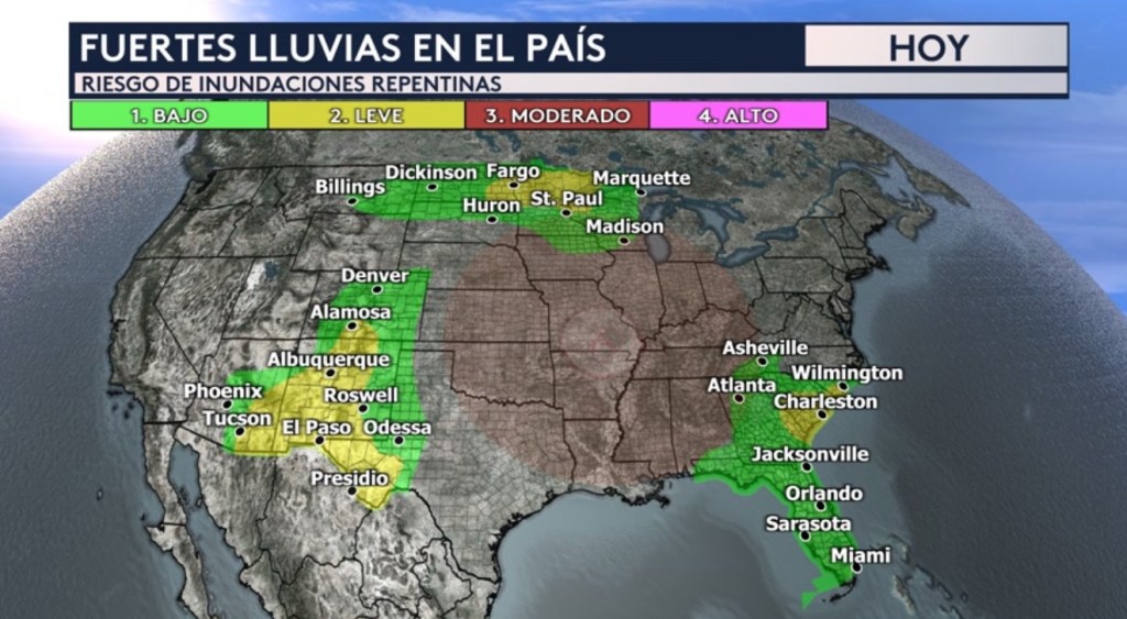 •Igual que ayer, veremos hoy como todas las precipitaciones estarán ocurriendo a los alrededores de este domo de calor. Tendremos al menos un riesgo bajo de nivel 1 de 4 de inundaciones para los desiertos del suroeste, y centro y sur de las Montañas Rocosas, el norte de las planicies, el Medio Oeste superior y el sureste del país. Incluye ciudades como Phoenix en Arizona; Roswell en Nuevo Mexico; Odessa en Texas; Denver en Colorado; Billings en Montana; Dickinson en Dakota del Norte; Huron en Dakota del Sur; Minneapolis y St. Paul en Minnesota; Madison en Wisconsin; Marquette en la península superior de Michigan; Atlanta en Georgia; Asheville en Carolina del Norte; y Jacksonville, Orlando, Sarasota, Tampa y Miami en Florida.