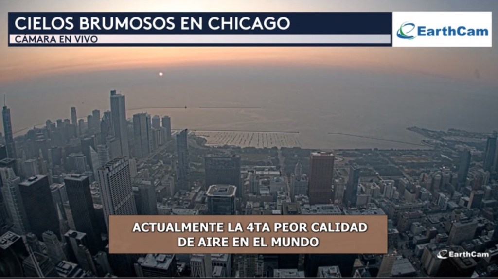 •Vemos una cámara en vivo desde Chicago, ¡donde la ciudad de los vientos actualmente se encuentra con la cuarta peor calidad de aire en el mundo! Vean como en el amanecer de esta mañana el sol tiene ese tinte de color naranja mientras que los rayos solares penetran a esos cielos brumosos en el horizonte.
