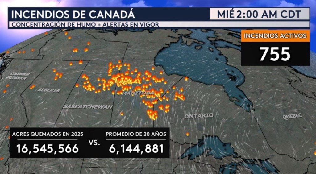 •Hay 755 incendios forestales activos en Canadá. En lo que va del año, los incendios forestales han quemado más de 16 millones de acres en Canadá, lo que es casi el triple del promedio de 6 millones de acres de los últimos 20 años.