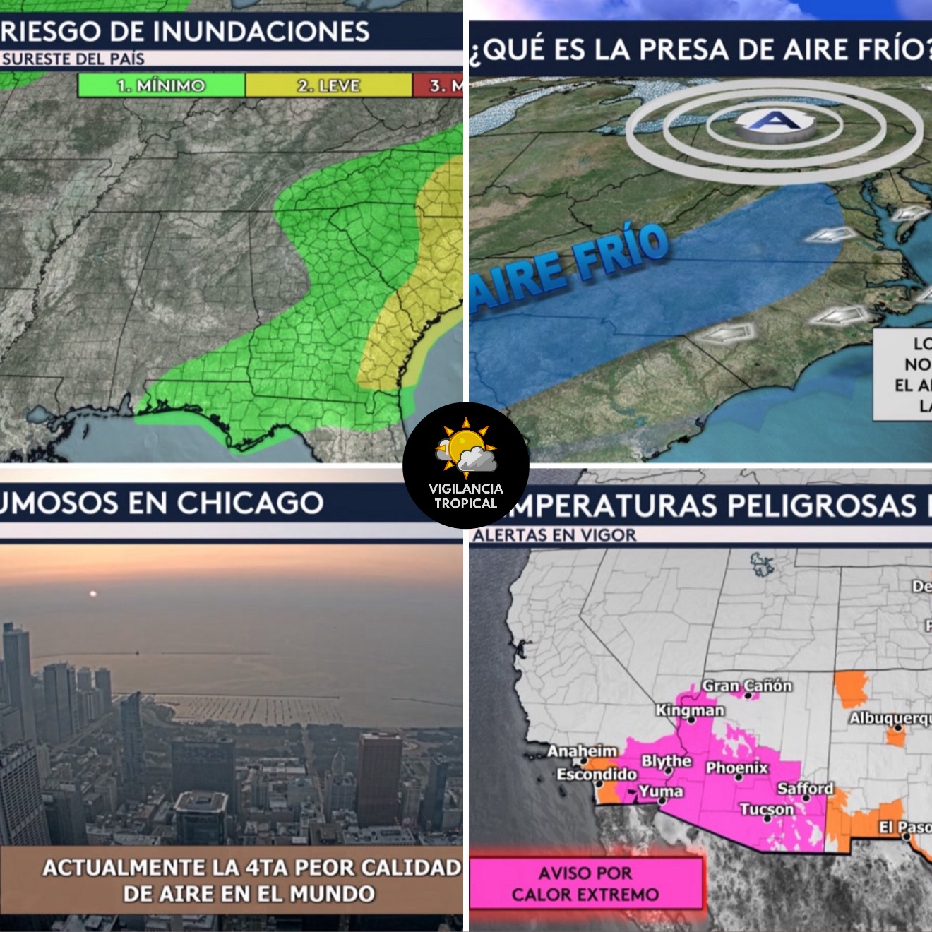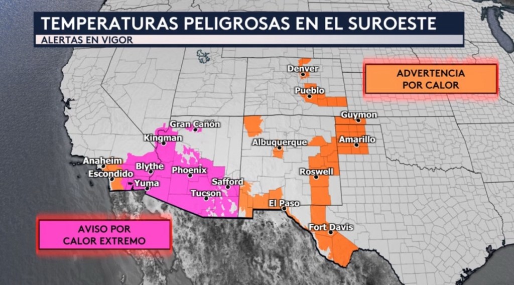 •No solo en Florida sino también hacia el suroeste del país estaremos experimentando esas temperaturas altamente peligrosas. Hay avisos por calor extremo en vigor para ciudades como Phoenix, Tucson, Yuma, y Kingman y advertencias por calor en vigor para Anaheim, Escondido, El Paso, Albuquerque, Amarillo y Denver.