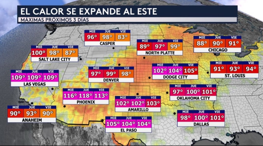 •Vean como durante los próximos días este calor se irá expandiendo al este hacia las planicies, el Medio Oeste y el Valle del Río Mississippi. La temperatura máxima en Chicago llegará a los 90°F a partir de mañana jueves y se mantendrá en ese rango hasta el viernes. St. Louis llegará al medio rango de los 90°F para finales de semana. Tanto Dallas como Oklahoma llegarán a los tres dígitos a partir de mañana mientras que la máxima en Dodge City en Kansas estará llegando a los 105°F para el viernes. Phoenix tendrá una máxima sofocante de 118°F mañana. Si se logra llegar a ese valor, romperá el récord para la temperatura más caliente jamás registrado en el mes de agosto. Tanto Denver como Salt Lake City estarán acercándose o llegando a los tres dígitos hoy y mañana.