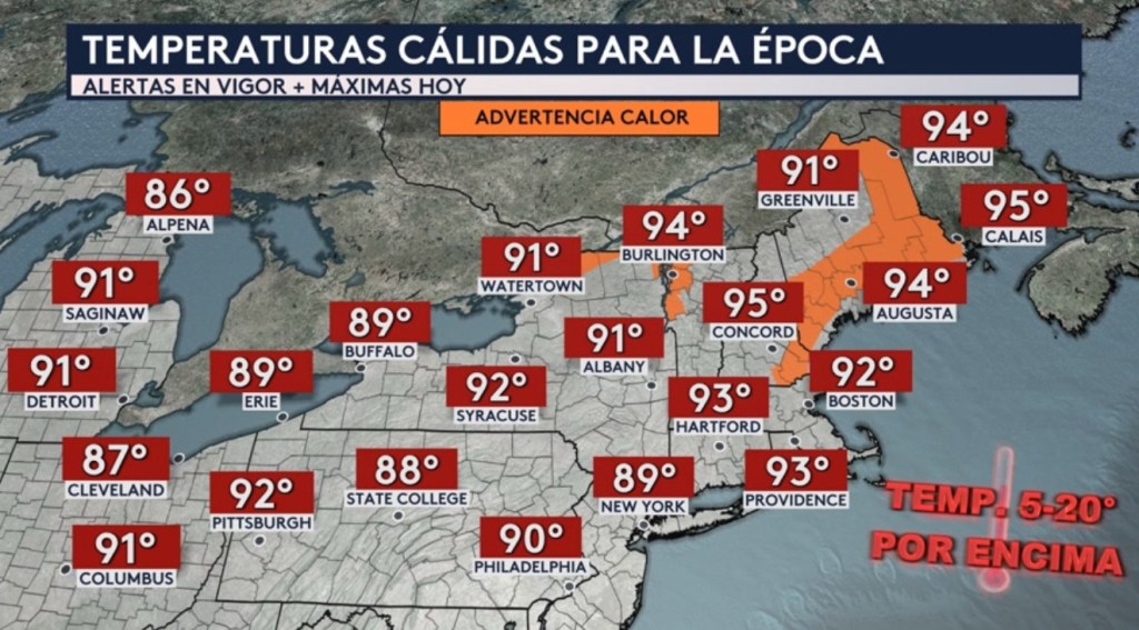 •No solo en Buffalo sino también a través del resto del noreste del país tendremos esas temperaturas de entre 5 a 20°F por encima del promedio para esta época del año. Esto incluye ciudades como Detroit, Cleveland, Columbus, Pittsburgh, Philadelphia, Nueva York y Boston. Las máximas para todas las ciudades mostradas hoy estarán en el rango de los 80°F y 90°F. Partes de Nueva Inglaterra que incluye las ciudades de Augusta, Caribou y Calais en Maine y Burlington en Vermont estarán bajo una advertencia por calor.