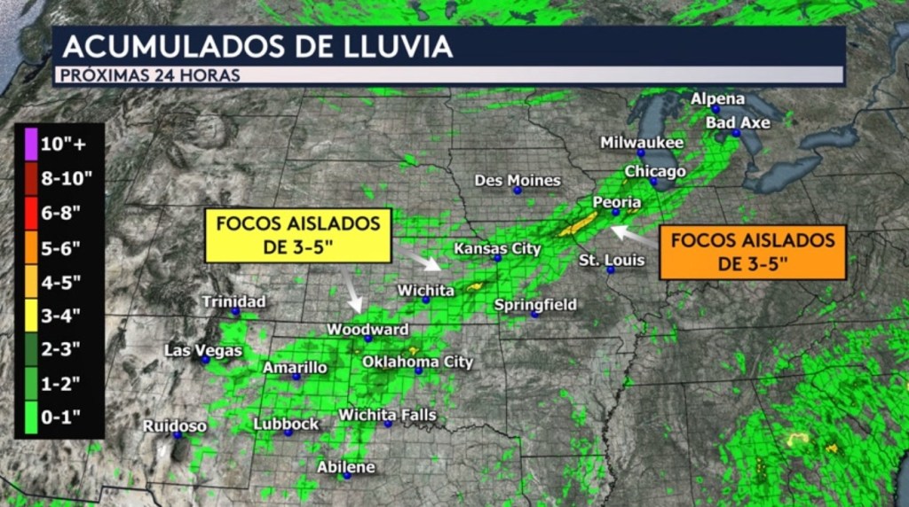•Nuestro modelo de pronóstico de alta resolución está mostrando la posibilidad de que tendremos focos aislados de entre 3 a 5 pulgadas de lluvia desde el sur de las planicies hasta el Medio Oeste inferior que incluye partes de los estados de Oklahoma, Kansas, Missouri, Iowa e Illinois. Este pronóstico de lluvia es para las próximas 24 horas.