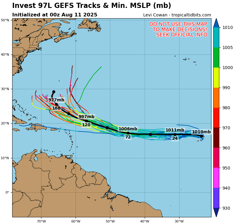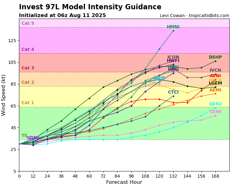 De lo que sí estamos muy seguros es que este sistema va tener el potencial de intensificarse gradualmente y probablemente convertirse en nuestro primer huracán de la temporada ciclónica 2025 del Atlántico. Miren a nuestra guía de modelos de intensidad como muestra el gradual ascenso en intensidad durante los próximos 7 días. Les mantendremos informados durante los próximos días sobre la evolución de este sistema y los cambios que vendrán con el.