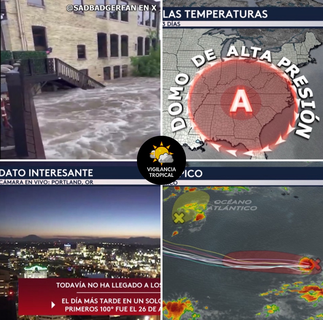 •Ahora nos vamos al Pacífico Noroeste del país y vemos a una cámara en vivo desde Portland en Oregón donde también estaremos hablando del calor excesivo. ¿Sabías que Portland todavía no ha llegado a los 100°F este año? El promedio del primer día de qué Portland llega normalmente a los 100°F es el 20 de julio y lo más tarde en un solo año que la ciudad ha llegado por primera vez a los tres dígitos es el 26 de agosto (lo que ocurrió en el año 1986).