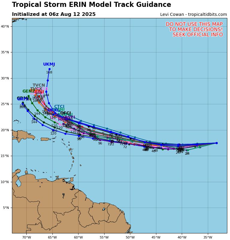 •Guías de trayectorias de la madrugada de este martes respecto a la Tormenta Tropical Erin