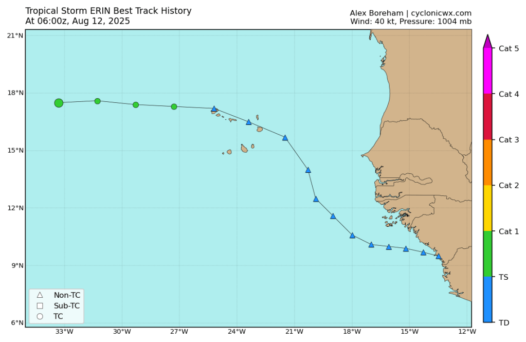 [Debido a su posición y época del año se mantendrá la estrecha vigilancia sobre la futura evolución y trayectoria de la Tormenta Tropical Erin] Manténgase informado!