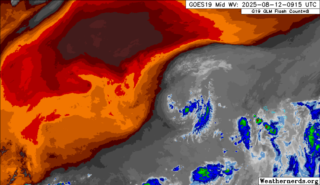 •Por otra parte continúa la presencia de aire seco afectando las áreas de lluvias y tormentas eléctricas (áreas convectivas) de Erin. Esto debe mantenerse a medida que el sistema siga avanzando por el Atlántico Tropical.
