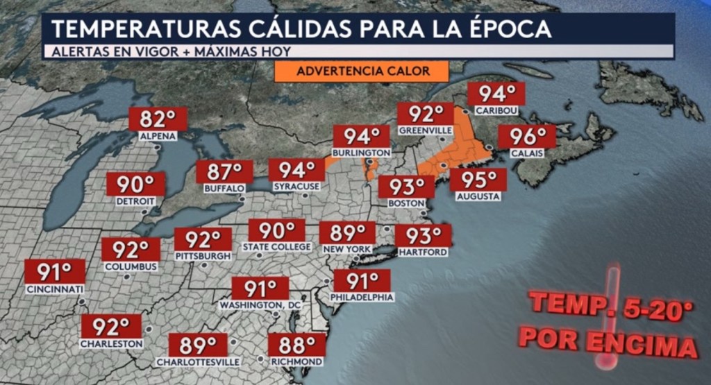 •Seguimos vigilando las temperaturas cálidas para el noreste del país que hoy estarán entre 5 a 20°F por encima del promedio para esta época del año. Incluye ciudades como Detroit, Columbus, Pittsburgh, Philadelphia, Washington DC, Nueva York y Boston. Donde encontraremos las condiciones más calurosas es hacia el norte del estado de Nueva York y partes de Vermont, Nuevo Hampshire y Maine donde hay advertencias por calor en vigor que incluye ciudades como Augusta y Caribou en Maine y Burlington en Vermont. Las advertencias para Nuevo Hampshire y Maine expirarán esta noche mientras que las que están en vigor para Nueva York y Vermont expirarán el miércoles por la mañana.