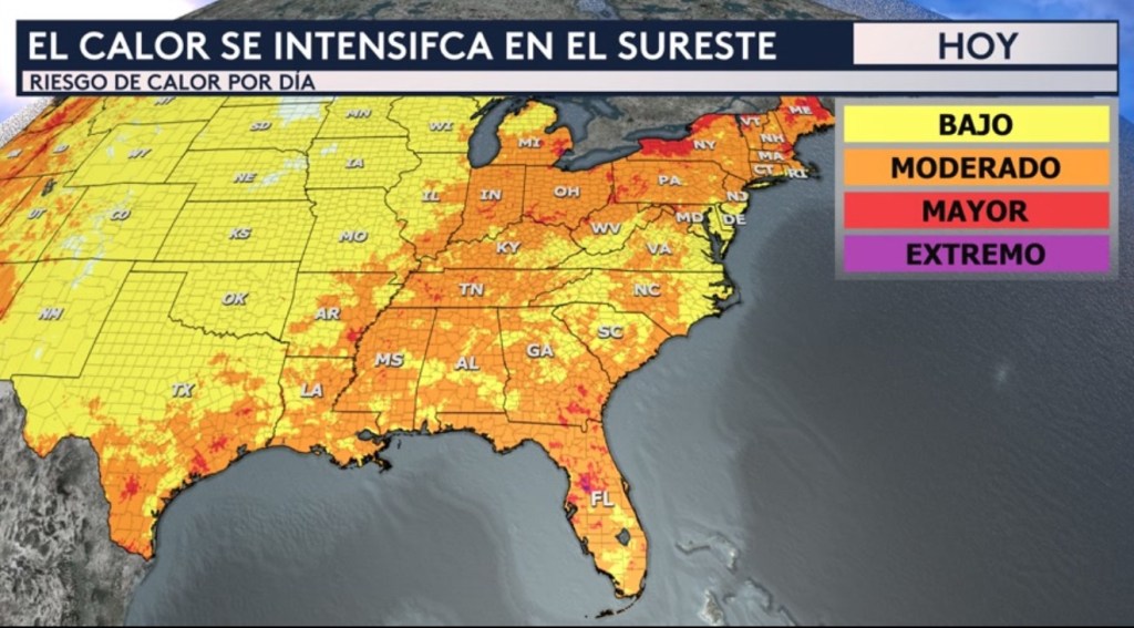 •Vemos como el calor se irá desplazando de norte a sur durante los próximos días, alejándose del norte e intensificándose en el sureste. Hoy el mapa del riesgo de calor nos muestra esos colores anaranjados y rojos para gran parte de la mitad este del país pero el calor será más fuerte hacia el noreste donde esos colores rojos que representan un riesgo mayor de nivel 3 de 4 en la escala de severidad están más generalizados.