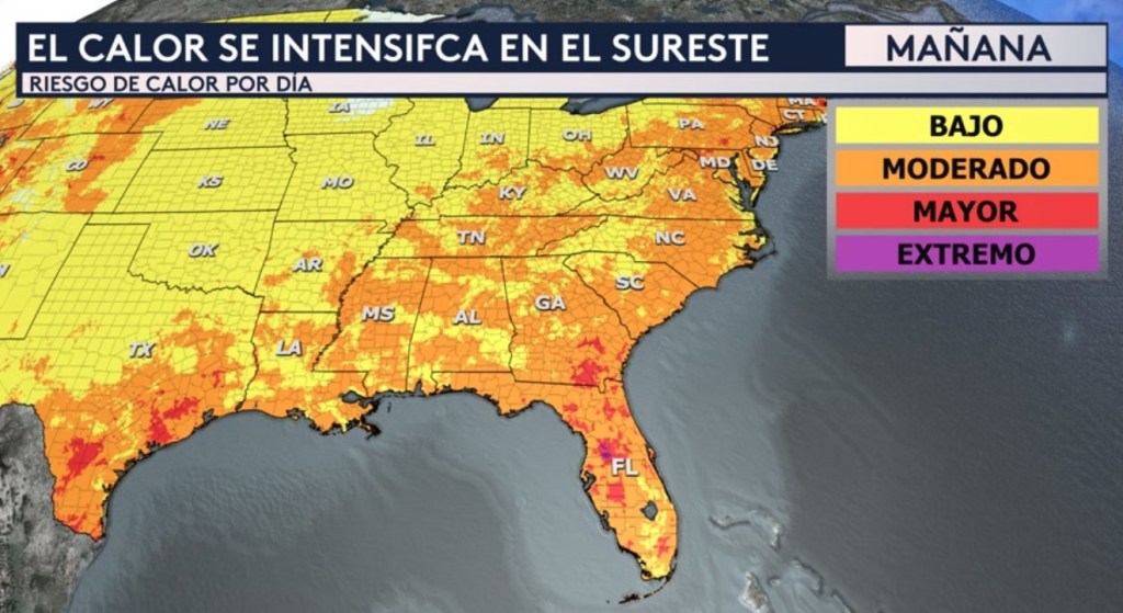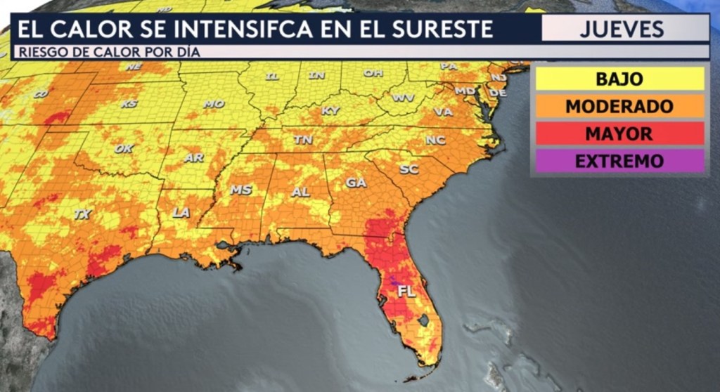 Para el jueves, tendremos más cobertura de esos colores rojos en el sureste y también veremos en algunos puntos localizados los colores morados, que representan los riesgos extremos de nivel 4 de 4 de calor. Con estos dos niveles más altos de calor, cualquier persona (no solo las personas que son especialmente vulnerables al calor) será capaz de sufrir una enfermedad relacionada con el calor si no se toma las precauciones necesarias como mantenerte adecuadamente hidratado y buscar una forma de enfriamiento.
